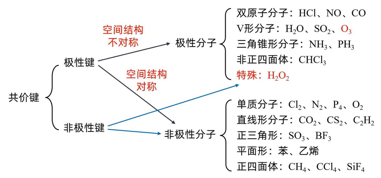 型分子中,中心原子的化合价的绝对值 等于 该元素的价电子数 时该分子为非极性分子,此时分子的空间结构对称;若中心原子的化合价的绝对值不等于其价电子数,则分子的空间结构不对称,其分子为极性分子,具体实例如下: 分子 中心原子的化合价的绝对值 该元素的价电子数 分子极性 非极性 非极性 非极性 非极性 极性 极性 极性 根据分子所含键的类型及分子立体构型判断
